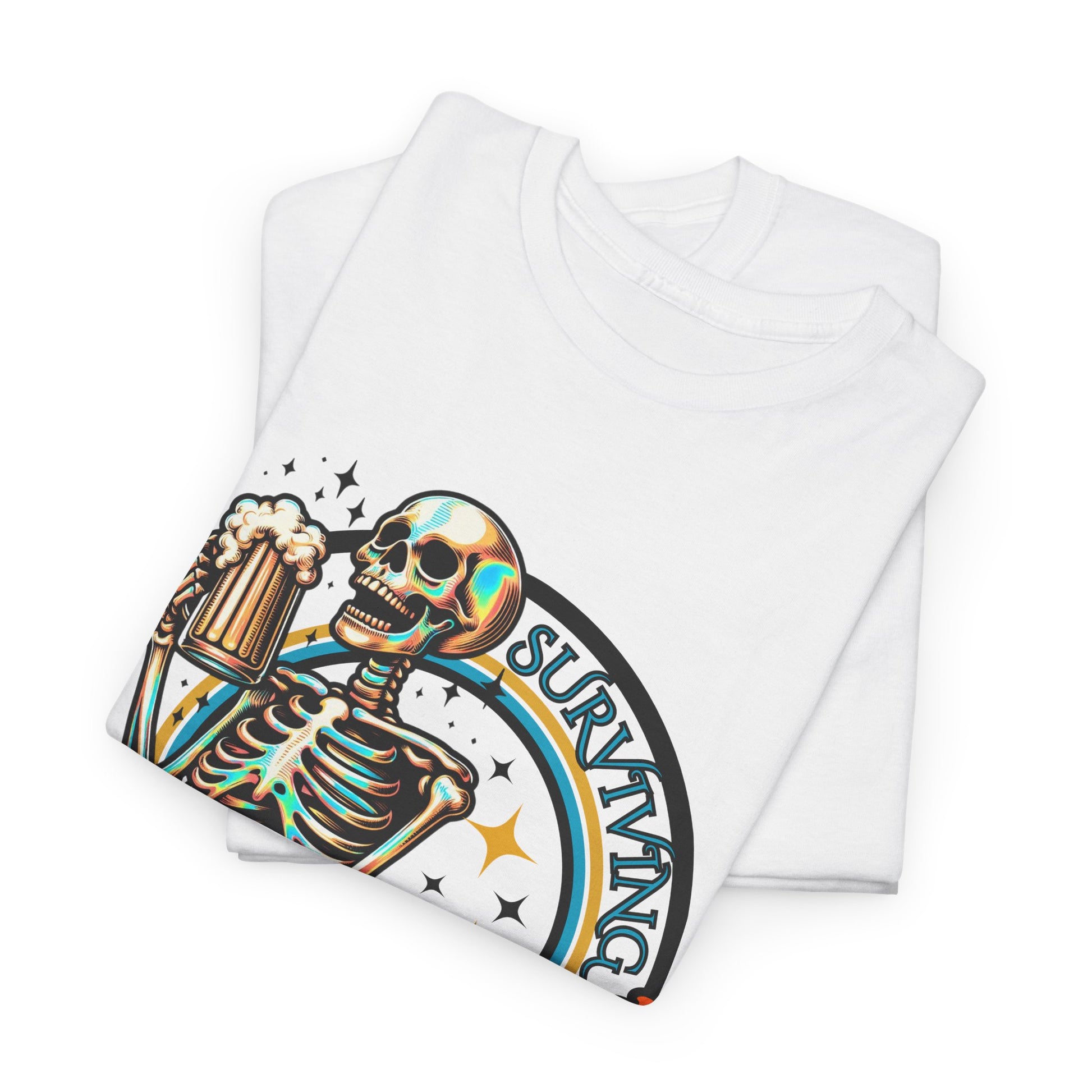 Celebrate the chaos of fatherhood with a hilarious twist with this colorful, retro-style skeleton raising a beer design. Perfect for Father’s Day, birthdays, or just because Dad needs a laugh. Ideal for dads and father figures looking for a humorous and comfortable shirt to wear year-round.