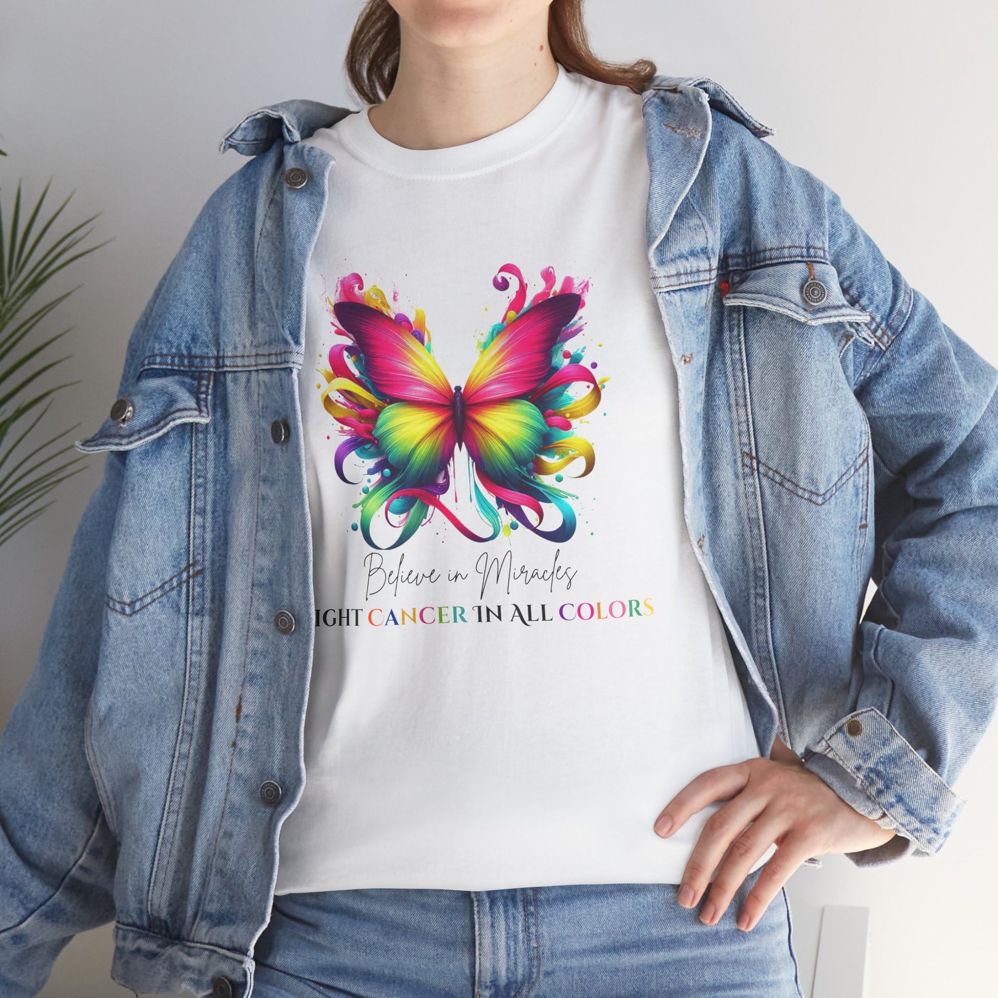 Show your support for all types of cancer with this colorful butterfly design on a comfortable unisex heavy cotton T-shirt. Perfect for wearing to cancer awareness events, fundraisers, or just for everyday wear. Ideal for adults looking to spread awareness and support for cancer causes.